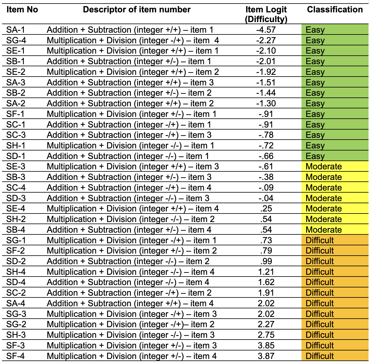 There were definite trends in the pattern of item difficulty among various combinations of integer operations. Problems that simply required identification and same-sign operations, particularly addition and subtraction of positive integers, were generally simple. In contrast, items requiring multiplying and dividing with mixed signs or negative-negative combinations, particularly at higher levels of application, were more commonly problematic.